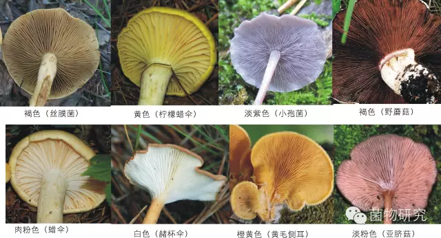 如同菌蓋的顏色,蘑菇菌褶的顏色也是豐富多彩的,也可作為識(shí)別蘑菇的輔助特征之一。值得注意的是菌褶的顏色往往和蘑菇的生長(zhǎng)階段有關(guān)系,更多的和菌褶上所形成的孢子的顏色有有關(guān),一般孢子成熟后顏色加深(如蘑菇)。